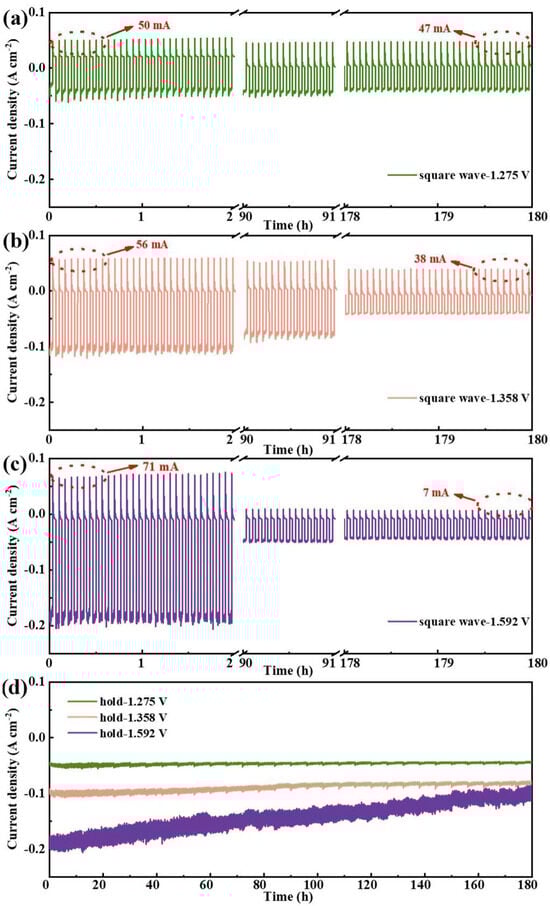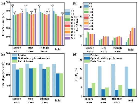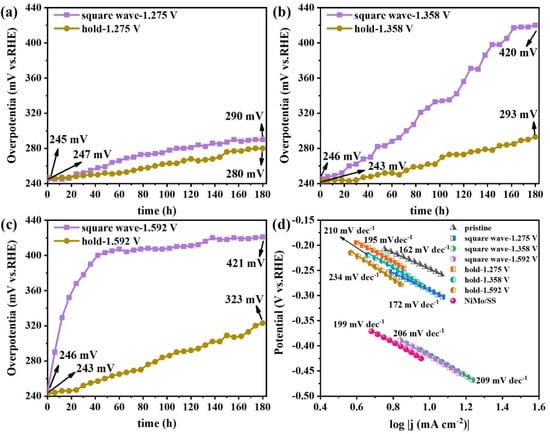 Overpotential (10 mA cm−2) at (a) −1.275 V (hold) and −1.275~0 V (square wave); (b) −1.358 V (hold) and −1.358~0 V (square wave); and (c) −1.592 V (hold) and −1.592~0 V (square wave). (d) Tafel slopes.