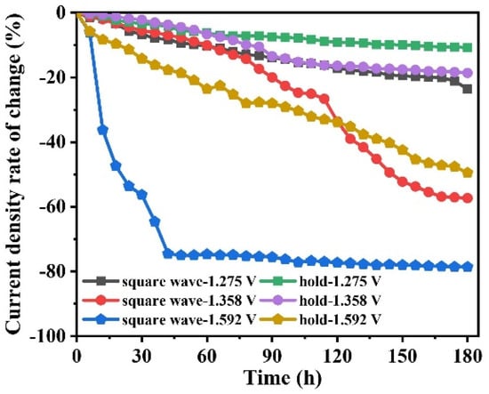 When the fluctuation amplitude was −1.275~0 V, for the first 2 h, the T-I curve exhibited an excellent response to the voltage fluctuation, and the current density reached 50 mA cm−2@−1.275 V. The current density continually decreased to 38 mA cm−2@−1.275 V after 180 h, with a decrease rate of 24% (Figure 6a and Figure 7). The decrease in current density indicated the decline in catalytic activity and hydrogen evolution efficiency. When the fluctuation amplitudes were −1.358~0 V and −1.592~0 V, current densities reached 100 mA cm−2@−1.358 V, and 200 mA cm−2@−1.592 V in the first 2 h, respectively. Both current densities gradually declined during the test time and finally reached 43 mA cm−2@−1.358 V (43 mA cm−2@−1.592 V), with decrease rates of 57% and 79%, respectively. The final current density values of the two were identical, possibly attributable to the loss of LDH structure on the electrode surface and the subsequent exposure of the NiMo coating. As the amplitude fluctuation increased, the decrease in the catalytic activity of FeNiMo-LDH@NiMo/SS became more pronounced. This provided evidence that a larger fluctuation range undermined the coating, resulting in a greater degradation in performance. As control tests, constant voltages of −1.275 V, −1.358 V, and −1.592 V were administered to the cathode, resulting in a slight reduction in current density with reduction rates of 11%, 19%, and 49%, respectively. FeNiMo-LDH@NiMo/SS exhibited decent stability at low holding voltages. The performance degradation caused by square-wave voltage was more pronounced compared to that of a constant voltage. These findings strongly suggested that large fluctuations exacerbated the detrimental impact on the catalytic behavior of the electrode.