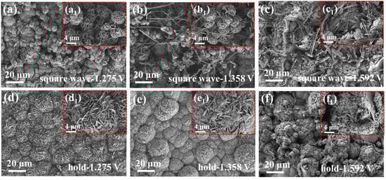 SEM images of FeNiMo-LDH@NiMo/SS. (a) −1.275~0 V in square wave. (b) −1.358~0 V in square wave. (c) −1.592~0 V in square wave. (d) −1.275 V in holding voltage. (e) −1.358 V in holding voltage. (f) −1.592 V in holding voltage.