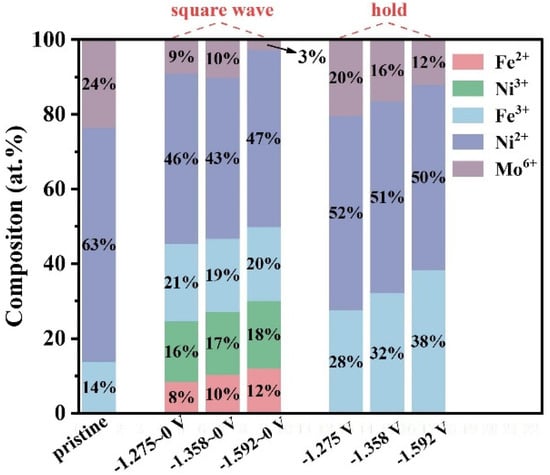 The spectral survey results (Figure S14) revealed the presence of Fe3+, Ni2+, and Mo6+ on the pristine FeNiMo-LDH@NiMo/SS surface, which was consistent with the findings of previous studies. After the square-wave test, characteristic peaks indicating the generation of Ni3+ and Fe2+ at FeNiMo-LDH@NiMo/SS were observed, as shown in Figure S15, while these peaks were not observed during the voltage hold test. This demonstrated that under fluctuating power conditions during the HER process, oxidation currents were generated at FeNiMo-LDH@NiMo/SS, leading to frequent oxidation–reduction reactions. By calculating the relative content of each element (as shown in Figure 10), we found that within a voltage range of −1.275~0 V, the relative contents of Ni3+ and Fe2+ were 16% and 8%, respectively. With an increasing fluctuation amplitude, these values slightly increased. When the fluctuation ranges were −1.358~0 V and −1.592~0 V, respectively, the relative contents increased to 17% and 18% for Ni3+, as well as 10% and 12% for Fe2+. The relative content of Mo6+ decreased from 24% for pristine FeNiMo-LDH@NiMo/SS to 9% (−1.275~0 V), 10% (−1.358~0 V) and 3% (−1.592~0 V), respectively. As fluctuation amplitude increased further, the relative contents of Ni3+ and Fe2+ also increased, correspondingly promoting higher degrees of electrode oxidation reaction. This phenomenon could be attributed to the augmentation of the oxidation current caused by the enlarged fluctuation amplitude, resulting in electrode dissolution and a decreased performance level. Simultaneously, increasing the amplitude led to a rapid decrease in Mo content, which was not conducive to water dissociation and increased the hydrogen adsorption free energy, thereby reducing the hydrogen evolution performance [61,72]. Therefore, it seems that the catalytic performance of FeNiMo-LDH@NiMo/SS is also affected by a decreased Mo content. Increasing the fluctuation amplitude significantly accelerates the degradation process, resulting in higher performance losses along with a decline in durability.