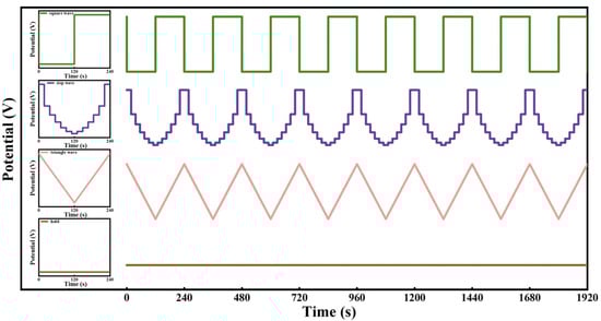In this study, the input voltage simulated the characteristics of solar power generation to obtain the T-I curve. The input voltage waves were square, step, triangle, and hold, and the voltage period was 240 s, as shown in Figure 11. The square-wave voltage was operated at a negative voltage (VHER) for 120 s. In the step-wave voltage, the 240 s period was divided into 13 equal parts, and for each of those, we operated at a different voltage. The triangle-wave voltage was reduced from 0 V to VHER in 120 s at a constant rate, and it was increased to 0 V in 120 s at the same rate. The holding voltage operated at a negative voltage (VHER).