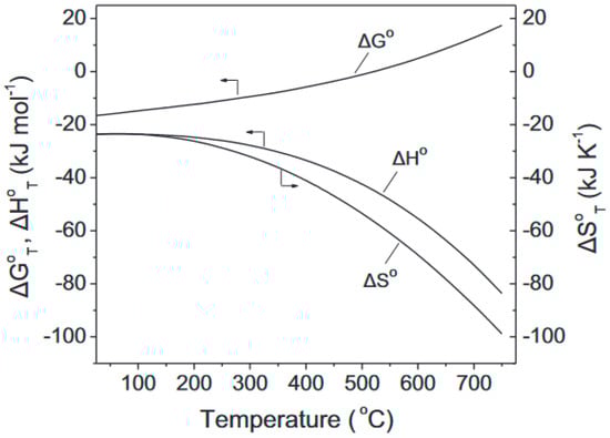 Akarmazyan et al. [30] presented a thermodynamic analysis of the methanol dehydration reaction to DME (Equation (1)) carried out using Outokumpu HSC Chemistry® software (Espoo, Finland). The results of this analysis are shown in Figure 1, where the profiles of the Gibbs free energy (ΔG0T), entropy (ΔS0T), and enthalpy (ΔH0T) changes in the reaction are plotted as functions of the reaction temperature. The reaction is exothermic, and enthalpy (ΔH0T) and entropy (ΔS0T) decrease with the increasing temperature. Therefore, the Gibbs free energy (ΔG0T) increases with the temperature, and at temperatures higher than 525 °C, where ΔG0T takes positive values, the reaction is not favoured thermodynamically.