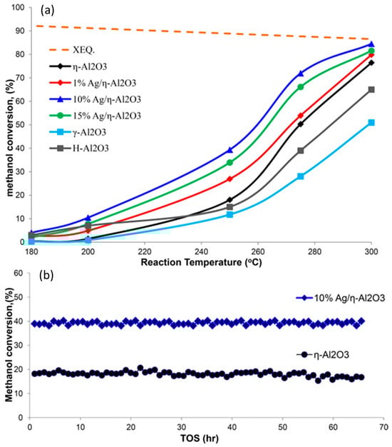 Catalytic activity profiles: (a) The effect of reaction temperature on methanol dehydration to DME with different Ag loading, along with the superhydrophobic alumina (H-Al2O3); reaction conditions: T = 180–300 °C; catalyst weight = 50 mg; He flow rate = 80 mL/min; WHSV: 48.4 h−1. (b) Time-on-stream test at 250 °C for the 10% Ag/η-Al2O3 and pure η-Al2O3 catalysts. Reprinted from [54], copyright (2017), with permission from the American Chemical Society.