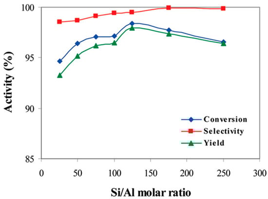 Variation in the methanol activity of H-ZSM-5 catalysts as a function of the Si/Al molar ratio at T = 573 K, P = 16 bar, and WHSV = 26.5 h−1. Reprinted from [61], copyright (2010), with permission from the American Chemical Society.