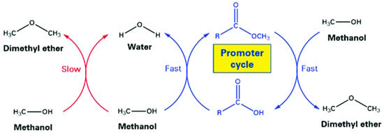 Catalytic cycles for DME formation from methanol showing the role of methyl carboxylate promoters. Reprinted from [81], copyright (2019), with permission from the Royal Society of Chemistry.