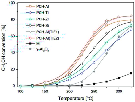Clay layered minerals, such as montmorillonites, vermiculites, or saponites, can be effectively intercalated with various inorganic pillars [90,91,94], resulting in the opening of the interlayer space for catalysis. The deposition of inorganic stable pillars into the interlayer space of the clay minerals results in the permanent separation of the mineral layers and the formation of high-surface-area materials. In contrast to acid-treated minerals, such pillared clays are characterised by a more uniform porous structure and preserved surface acidity, which can be increased by the deposition of the interlayer pillars containing elements generating acid sites, such as aluminium or titanium. Chmielarz et al. [95] studied porous clay heterostructures (PCHs) obtained by the intercalation of montmorillonite with silica, silica–alumina, silica–titania, and silica–zirconia pillars in the role of catalysts for methanol-to-DME conversion. The catalysts were prepared by the surfactant-directed method, including the deposition of cationic alkylammonium surfactants and neutral alkylammonium co-surfactants into the interlayer space of the montmorillonite. Surfactants and co-surfactants formed the ordered micellar structures in the interlayer space of mineral. In the next step, tetraethyl orthosilicate (TEOS) was hydrolysed by water present in the interlayer space of the clay mineral, which condensate around the micellar structure with the formation of silica pillars, permanently increasing the interlayer distance in the montmorillonite. In the final step, organic surfactants were removed from the porous structure of the PCHs by calcination. In the case of montmorillonite intercalation with silica–alumina, silica–titania, and silica–zirconia pillars, TEOS was mixed with the aluminium (aluminium isopropoxide), titanium (titanium isopropoxide), or zirconium (zirconium isopropoxide) source, respectively. The incorporation of these metals into the silica pillars resulted in the generation of additional acid sites. The specific surface area increased from 77 m2/g for the parent montmorillonite to 318–642 m2/g for the pillared samples. The PCH samples presented catalytic activity in the MTD process, which depended on the strength and concentration of the acid sites in the modified clay minerals. In this series of catalysts, as it is presented in Figure 5, the best results were obtained for the PCH sample intercalated with the silica–alumina pillars (PCH-Al), which were more catalytically active than the silica-intercalated montmorillonite (PCH-Si). In the latter case, the acid sites are located only on the montmorillonite layers, while, in PCH-Al, the acid sites are located both on the montmorillonite layers and on the silica–alumina pillars.