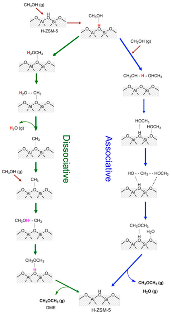 Two mechanisms—dissociative and associative—were proposed for the conversion of methanol to DME in the presence of H-ZSM-5 (Scheme 3) [85,86]. It should be noted that, in both cases, the key role was played by the Brønsted acid sites. These mechanisms were postulated for H-ZSM-5, but they are probably also valid for other zeolite catalysts for the MTD process.