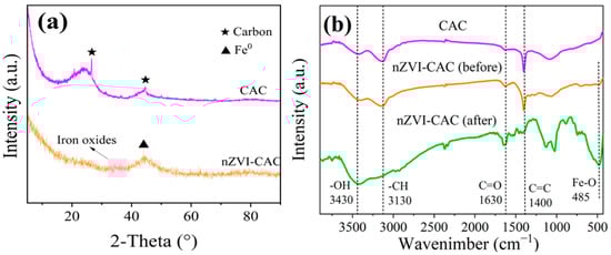 - Wu, Y.; Yue, Q.; Ren, Z.; Gao, B. Immobilization of Nanoscale Zero-Valent Iron Particles (nZVI) with Synthesized Activated Carbon for the Adsorption and Degradation of Chloramphenicol (CAP). J. Mol. Liq. 2018, 262, 19–28. [Google Scholar] [CrossRef]