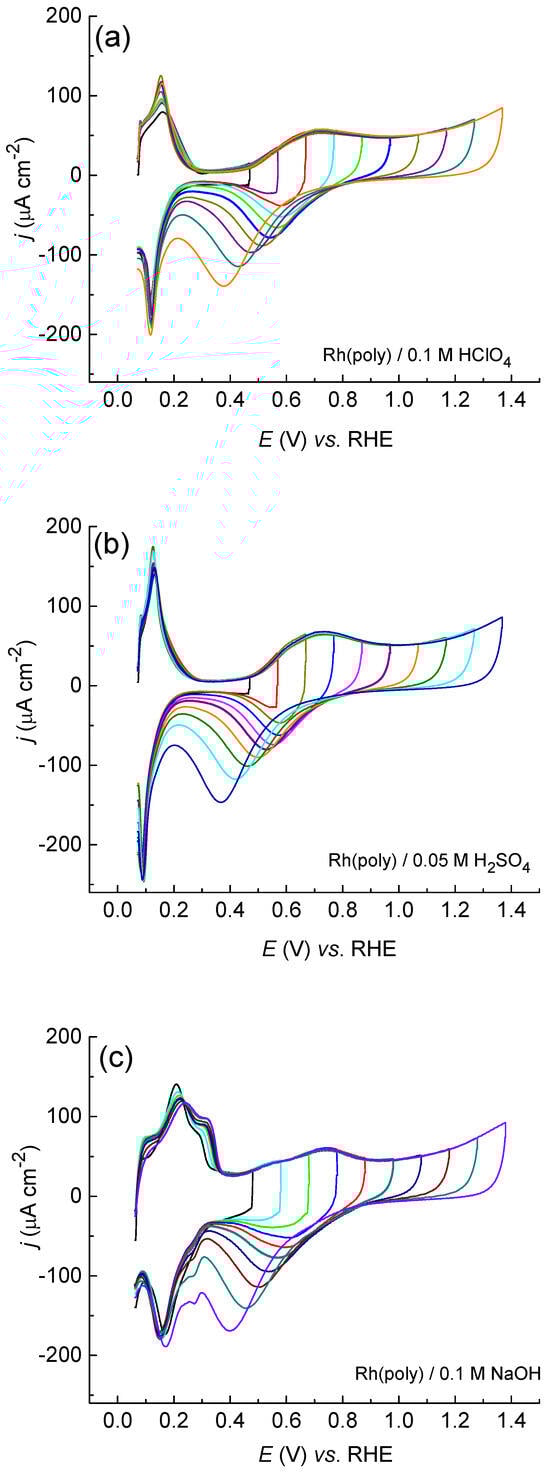 Cyclic voltammograms of Rh(poly) with the opening of the positive potential limit recorded in deaerated (a) 0.1 M HClO4, (b) 0.05 M H2SO4, and (c) 0.1 M NaOH solutions. The scan rate was 50 mV/s.