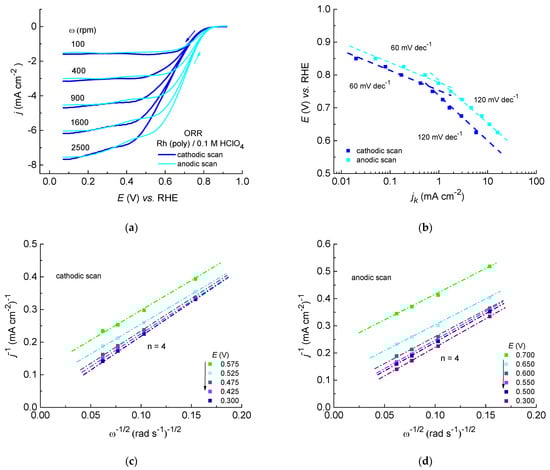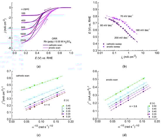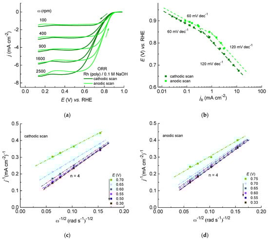Figure 4c,d display K–L plots for ORR on Rh(poly) in 0.1 M NaOH, recorded in cathodic and anodic directions. The total number of electrons exchanged is calculated using Equation (14), and from the data for 0.1 M NaOH from ref. [41], where is 1.22 × 10−3 mol L−1, is 1.90 × 10−5 cm2 s−1, and ν is 0.01 cm2 s−1.