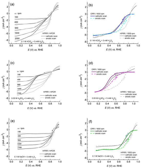Polarization curves for HPRR/HPOR in both the cathodic and anodic directions are recorded for three investigated basic solutions and compared with corresponding ORR curves for the same rotation rate of 1600 rpm, as illustrated in Figure 5.