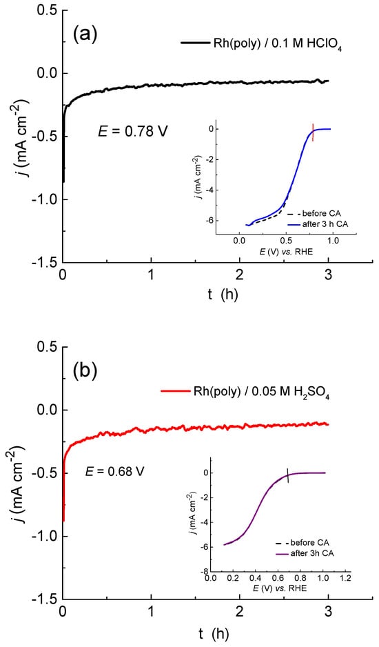The CA curve in Figure 6a, recorded in oxygen-saturated 0.1 M HClO4 at 0.78 V, shows a decrease in the current density in the first half an hour. After that, a constant current density is achieved, indicating that the Rh(poly) remains stable. The inset shows that the ORR polarization curve after the CA only differs from the initial one at high current densities starting at a potential approaching the diffusion control region. These differences are due to the changes in the transport of molecular oxygen to the electrode surface over time. The overlap of the two polarization curves in the activation and mixed control regions indicates that the electrode surface remains stable after CA testing.