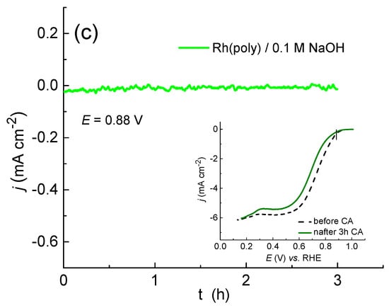 The CA curve for Rh(poly) in 0.1 M NaOH, recorded at 0.88 V (Figure 6c), shows that the current density slowly decreases over three hours. The two ORR polarization curves recorded before and after CA testing are different, showing the same ORR onset potential, but the shift of the half-wave potential for 0.04 mV towards more negative values. This means that the ORR activity of Rh(poly) in an alkaline solution, although the highest of all, decreases over time, due to the changes in the Rh(poly) electrode surface. It is very likely that, similar to the ORR on Pd(poly) in alkaline solution [43], these changes can be ascribed to the onset of RhOH formation at lower potentials.