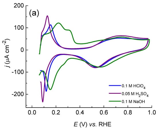 To confirm the accuracy of the data in Table 1, the electrochemically active surface area (ECSA) of the used Rh(poly) electrode in three different solutions is reconsidered. ECSA can be calculated from the hydrogen adsorption or desorption peak as the charge passed during hydrogen adsorption assuming that one hydrogen atom can be adsorbed on a single Rh atom. This method assumes that the total charge passed between the adsorbing hydrogen and the Rh surface for polycrystalline Rh is 221 μC cm−2 [32]. The ECSA values are calculated from the ratio between the charge calculated for Rh(poly) in three solutions and the accepted value for Rh, considering that the electrode’s geometric area is 0.196 cm2. The charges calculated from the hydrogen desorption peaks for Rh(poly) in 0.1 M HClO4, 0.05 M H2SO4, and 0.1 M NaOH are 211, 220, and 234 µC/cm2, giving the ECSA values of 0.187, 0.196 and 0.207 cm2, respectively.