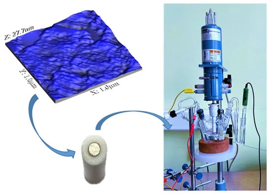 A commercial polycrystalline rhodium electrode, 5 mm in diameter, 0.196 cm2 geometric area (MaTech, Jülich, Germany), was used as a working electrode. Before each measurement, the electrode was mechanically polished using alumina powder with 1 μm, 0.3 μm, and 0.05 μm particle size, rinsed with Milli-Q water, and cleaned in an ultrasonic Milli-Q water bath. The polished Rh(poly) electrode was characterized using atomic force microscopy (AFM). The imaging was performed using Multimode SPM (Veeco Instruments, Inc., Munich, Germany). The electrode was mounted into a homemade Teflon holder fitting the shaft and an MSR Rotator (PINE Research Instrumentation, Inc., Durham, NC, USA) for electrochemical measurements. Scheme 1 presents the 3D AFM image of the Rh(poly) surface and the RDE experimental setup. AFM image reveals a rhodium surface consisting of many crystallites resulting in an average surface roughness of 2.9 nm.