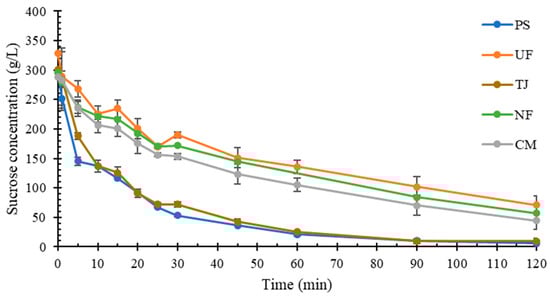 Furthermore, in comparison to Figure 1, the same difference in the hydrolysis rates between molasses subjected to different treatments (CM, UF, NF) and those of a high purity of sucrose (PS and TJ) was observed. Therefore, there was no difference between using the pure enzyme and whole cells in any of the solutions. Therefore, we conclude that using whole cells is still more beneficial for the further development of the sucrose hydrolysis process, especially with regard to scalability, process costs, and biocatalyst isolation afterwards.