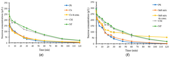 Effects of different salts on sucrose hydrolysis in pure sugar (PS) solution, nanofiltration retentate (NF), and crude molasses (CM). The elements added to the PS solution were (a) Na, (b) Mg, (c) K, (d) Ca, (e) Cu, and (f) a mix of them all.