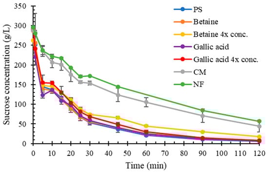 Hydrolysis inhibition experimental results illustrating the effects of betaine and gallic acid, where PS = pure sucrose, NF = nanofiltration retentate, and CM = crude molasses.