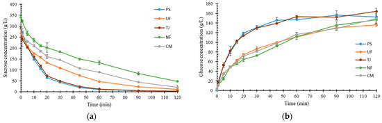 Sucrose hydrolysis with invertase as a free enzyme shown as substrate consumption (a) and glucose product formation (b), where PS = pure sucrose, UF = ultrafiltered molasses, TJ = thick juice, NF = nanofiltration retentate, and CM = crude molasses.