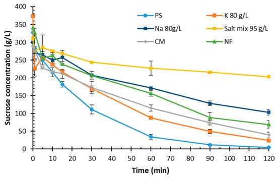 Furthermore, in comparison to one of our previous studies, it was also shown that the previous positive effects of NF on the hydrolysis rate were no longer profound [14]. This can be explained by the high buffering capacity of the molasses, where the initial pH was previously not adjusted and was approx. pH 9. The pH dropped more for the NF than the CM, since NF molasses contains fewer salts than CM, which approached more optimal pH ranges for the invertase enzyme [14]. As Figure 1 shows, there was no difference in the hydrolysis rate of sucrose in the NF or CM when the reaction was carried out under the optimum pH (4.5). This means that the previous positive effects of nanofiltration on molasses were possibly just a change in buffering capacity. Section 3.3 shows further the effects of the inorganic low-molecular-weight compounds present in the molasses.