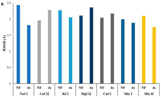 Attempting to understand the molecular interactions and potential inhibitory effects of some salts on the activity of invertase, computational investigations of the crystal structure of the enzyme were conducted. Initially, the octamer structure of the invertase derived from Saccharomyces cerevisiae was used in its entirety in the MD simulation studies, due to the importance of dimerization of dimerization in determining the substrate specificity and stability of the enzyme [40]. Overall, no significant deviation of the structure was observed (Figure S3), even in the presence of high concentrations of the salts and with a prolonged simulation time. However, certain salts were found to have the same effect at low and high concentrations (i.e., KCl, Mix I), whereas most of the salts increased the deviation of the structure at four times higher concentrations (CaCl2, MgCl2, CuCl). Surprisingly, NaCl and Mix II lowered the deviation of the structure at higher concentrations, which might be a result of increasing the rigidity of the structure at high concentrations of the salts rather than unfolding of the protein (Figure 7A,B). The most significant effect was observed with 7.25 g/L of NaCl (NF molasses concentration), followed by MgCl2, KCl, and CaCl2 at four times the baseline concentration.