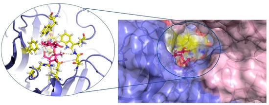 Productive docking pose within subunit A. Subunit A surface in blue, subunit B in pink, active site residues in yellow, and sucrose in red sticks. H bonds formed between sucrose and the active site residues are shown in yellow dots (left side).