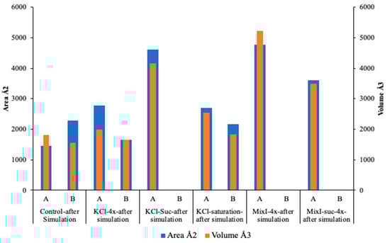Area and volume calculated for the active site cavity of subunit AB after MD simulation with different salts concentrations.