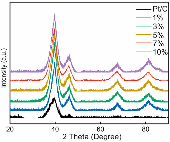 In order to investigate the crystal structure characteristics of the catalyst, XRD analysis was conducted to different IL-loaded Pt/C electrocatalysts, and the obtained XRD patterns are shown in Figure 1. The pristine Pt/C electrocatalyst shows a broad peak at 39.8° which is indexed to a Pt (111) crystal facet; however, for the Pt/C electrocatalyst modified by IL, the intensity of the diffraction peak increases significantly, in particular for the peaks detected at 46.2°, 67.5°, and 81.3°, which can be ascribed to the corresponding Pt (200), (220) and (311) crystal facets of the face-centered cubic (fcc) structure [24]. The results reveal that IL modification leads to the cover of IL on the Pt elctrocatalyst nanoparticle surface, and also that this modification improves crystallinity, which is consistent with the literature [25].