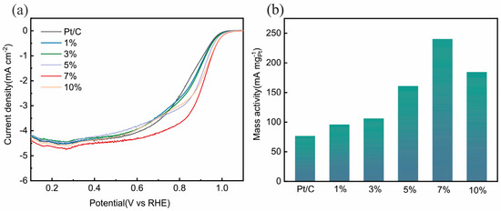 In order to investigate the influence of the IL modification on the electrocatalytic activity of the catalyst, linear scanning voltammetry (LSV) analysis was performed with the half-cell RDE measurement. Figure 5a shows the LSV curves in O2-saturated 0.1 M HClO4 at room temperature for commercial Pt/C and Pt/C+[MTBD][beti] electrocatalysts. The half-wave potential of the catalyst increases with the increase in IL, from 0.8 V for Pt/C to 0.82 V for 1 wt% IL, and then to 0.83 V and 0.88 V for 3 wt% and 5 wt%; finally, the addition of IL reaches the maximum value 0.9 V at 7%. A further increase in the IL amount to 10% leads to a drop of the half-wave potential. The mass activity of the catalysts at 0.9 V vs. RHE was then calculated, and shown in Figure 5b. The mass activity of the IL–modified Pt/C catalysts increased by a factor of 3.2, from 76.57 mA/mgPt for the pristine Pt/C to 240.37 mA/mgPt for the one modified with 7% IL. This significant improvement of the ORR activity can be attributed to the adsorbed [MTBD][beti] inhibiting the formation of Pt oxides and attenuating the Pt–O interactions, thus protecting the active sites of the catalysts from the inactive oxide [17,34]. Overall, IL molecules will preferentially interact with those low-coordinated Pt sites, thus enhancing ORR performance [13]. However, a higher IL loading (i.e., 10 wt%) has a negative impact on ORR performance, regardless. This is due to the fact that the excess IL forms a much thicker layer, and thus, a long diffusion path, which restricts the diffusion of O2 to the catalytic sites, resulting in a lower O2 concentration at the catalytic cites and a lower ORR reaction rate [14].