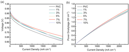Figure 6a,b show the polarization curves and power density curves for the MEAs with cathodes composed of the pristine Pt/C and IL–modified Pt/C catalysts. MEAs with the IL–modified Pt/C catalysts showed better power performance than the unmodified Pt/C catalyst over the entire current density region studied. The degree of improvement is related to the amount of the added IL. When the IL content is 7%, the improvement in power performance reaches the highest level. At a current density of 2.4 A/cm2, the power density increases from 1.46 W/cm2 for the pristine Pt/C electrocatalyst to 1.60 W/cm2 for the one modified with 7% IL. This improvement can be explained by two reasons. (i) In the low-current-density region, the high solubility of O2 in IL increases the oxygen concentration on the catalyst surface to facilitate the reaction; and, at the same time, IL can reach the active sites of the Pt nanoparticles below the very top surface of the catalyst support, e.g., those trapped in the micropores, thus increasing the available sites for oxygen adsorption, which improves ORR kinetics during the fuel cell operation. (ii) In the high-current-density region, due to the hydrophobicity of IL, the water generated by the reaction can be quickly excluded from the catalyst surface, preventing it from covering on the catalyst surface, which provides more TPB active sites and lowers the resistance of the reactant O2 transport inside the catalyst layer, thus improving the fuel cell performance. However, the power density decreases with IL addition up to 10%. This is due to the excessive IL adsorption covering too much surface of the electrocatalyst nanoparticles, resulting in larger oxygen transport resistance inside the catalyst layer, and excessive IL clogging in the internal microporous structure of the catalyst, which ultimately leads to a decrease in the power density of the fuel cell during operation.
