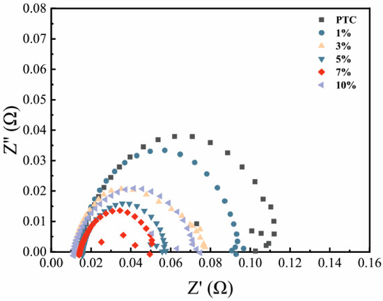 To further understand performance enhancement mechanisms, EIS analysis was performed at 0.9 V for the MEAs, and the results are shown in Figure 7. At a high potential and low current density, the main impedance is contributed by the charge transfer resistance represented by the diameter of the impedance semicircle on the EIS spectra, reflecting the catalytic kinetic performance of the electrode [35]. It can be seen that the impedance semicircle diameter starts to decrease with the increasing IL addition, which indicates an improvement in the charge transfer performance. The 7% IL addition shows the minimum charge transfer resistance, which is consistent with the power performance obtained in Figure 6a,b. The EIS results tested by Arezoo Avid [36] show that proton conductivity is proportional to pore filling, but higher proton conductivity comes at the cost of greater local oxygen transport resistance. Therefore, the best performing IL should be the one that achieves a compromise between the two. This is consistent with the LSV and power density test results.