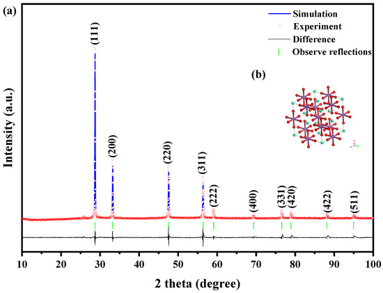 (a) XRD pattern and (b) the atomic structure (red atom: O, purple atom: Nd or Sb, green atom: Sm) of Sm2NdSbO7.