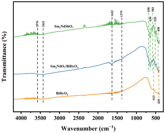 Figure 4 shows distinct absorption peaks in the FTIR spectra of SBHP, Sm2NdSbO7, and BiDyO3. The peaks identified were related to Sm−O, Nd−O, Sb−O, Sb−O−Sb, Bi−O, and Dy−O bonds. The stretching vibration (SV) of Sm−O occurred at 520 cm−1 [60,61], whereas the SV of Nd−O was seen at 630 cm−1 [62]. The Bi−O bending vibration (BV) peak was observed at 428 cm−1 [63], and the Dy−O SV peak was found at 613 cm−1 [64]. The Sb−O BV was detected at 458 cm−1 and 583 cm−1 [65]. The BV of Sb−O−Sb was shown by peaks at 658 cm−1 [66]. The wide peaks found between 3431 cm−1 and 3576 cm−1 represent the SV of O−H groups from chemisorbed water molecules [67,68]. The peak at 1632 cm−1 represents the BV mode of the O−H groups [69]. The bands found between 1379 cm−1 and 1632 cm−1 were identified as vibrations of C−H bonds from adsorbed water [70,71].