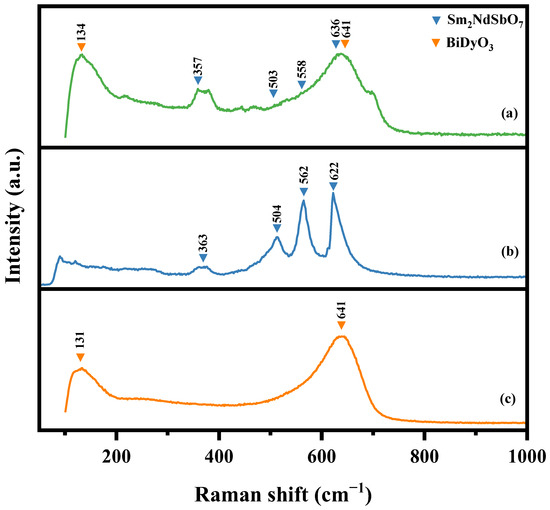 Raman spectra of (a) SBHP, (b) Sm2NdSbO7, and (c) BiDyO3.