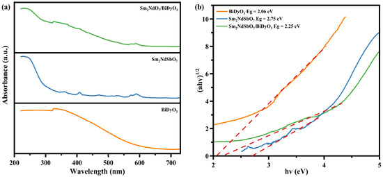 Figure 6 displays the absorption spectra of SBHP, Sm2NdSbO7, and BiDyO3 samples. The absorption edges were observed at 551 nm, 450 nm and 602 nm in the visible range of the spectra, as shown in Figure 6. The band gap energies of crystalline semiconductors could be calculated by identifying the point where the photon energy (hν) axis intersects with the extrapolated line from the linear section of the absorption edge of the Kubelka–Munk function (1) [78].