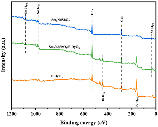 Figure 7 shows the XPS measurement spectra of SBHP, Sm2NdSbO7 and BiDyO3. The presence of Sm, Nd, Sb, Bi, Dy and O elements in SBHP could be clearly seen, which proved the successful preparation of heterojunction structure. An observed carbon signal was identified as adventitious hydrocarbon, used as a calibration.