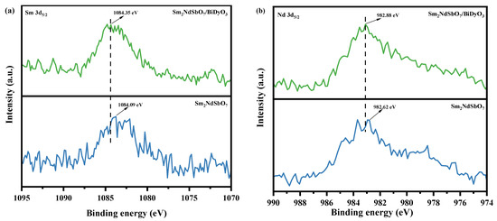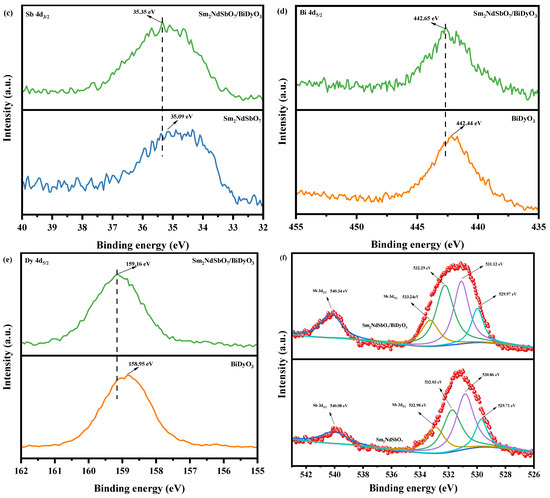 It could be seen from Figure 8 that various element peaks with specific binding energies were obtained; demonstrably, the Sm 3d5/2 peak of samarium for Sm2NdSbO7 was situated at 1084.09 eV, and the Nd 3d5/2 peak of neodymium for Sm2NdSbO7 was situated at 982.62 eV. The Sb 4d5/2 peak of antimony for Sm2NdSbO7 was situated at 35.09 eV. The Bi 4d5/2 peak of the bismuth for BiDyO3 was situated at 442.44 eV. The Dy 4d5/2 peak of the dysprosium for BiDyO3 was situated at 158.95 eV. Comparison with the XPS map of SBHP found that these peaks showed a slight shift toward higher binding energy. These shifts confirmed the presence of a strong interfacial interaction between Sm2NdSbO7 and BiDyO3, potentially resulting from electron transfer and delocalization between these two components in heterojunction photocatalytic materials.
