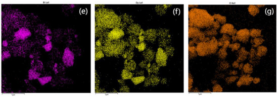(a) EDS elemental mapping of SBHP; (b) Sm, (c) Nd, (d) Sb, (e) Bi, (f) Dy, and (g) O.