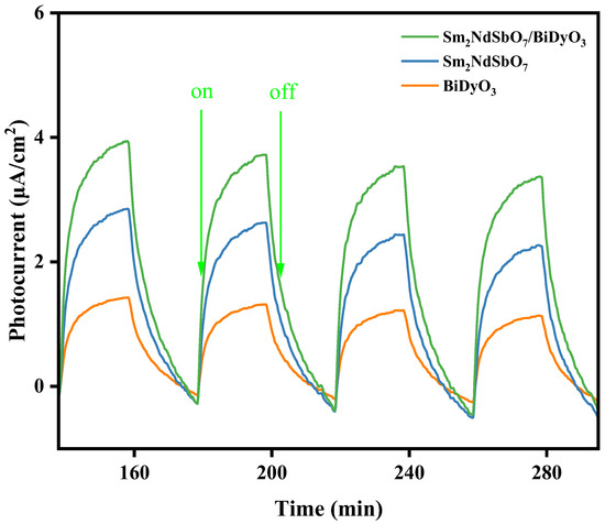 Transient photocurrent of SBHP, Sm2NdSbO7, and BiDyO3.