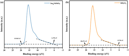 UPS spectra of (a) Sm2NdSbO7 and (b) BiDyO3 (the intersections of the black dash lines indicated by the black arrows indicated the onset (Ei) and cutoff (Ecutoff) binding energy).