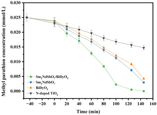 In the photocatalytic degradation experiment, the adsorption equilibrium experiment was carried out between −40 min and 0 min, and the adsorption equilibrium experiment was mainly to exclude the influence of photocatalyst adsorption on pollutant concentration. After the adsorption equilibrium was reached, it could be considered that the subsequent decrease in the concentration of pollutants was caused by photocatalytic degradation. N-doped TiO2 (N-T), a widely recognized visible-light-responsive photocatalyst, was employed as a benchmark to assess and compare the differences in photodegradation efficiency among various catalyst samples. In this study, we chose the organophosphorus pesticide methylparathion, and the potential surface charge present is a negative charge.