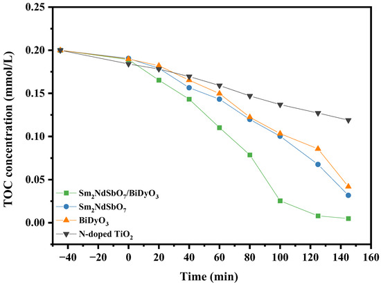 The concentration curve (CTC) of MP gradually decreases with the increase of VLIRD time. It could be seen from Figure 16 that MP was degraded by SBHP, Sm2NdSbO7, BiDyO3 and N-T, respectively. The RMR of TOC, which was derived from PW, reached 97.58%, 84.15%, 79.06% and 40.52%, respectively, after 145-VLIRD. In summary, it could be seen from the above results that the RMR of TOC in the presence of SBHP with descending MP was higher than that of Sm2NdSbO7, BiDyO3, or N-T. The above results also showed that in the presence of Sm2NdSbO7, the RMR of TOC during the degradation of MP was much higher than that of BiDyO3 or N-T, which meant that compared with Sm2NdSbO7, BiDyO3, or N-T, SBHP has the greatest efficiency in the degradation of MP.