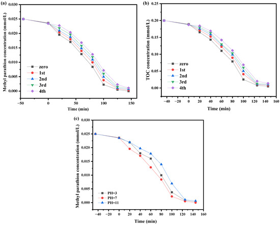 (a) CTC of MP during PHDE of MP, which is derived from PW with SBHP under VLIRD for four cycle degradation tests. (b) CTC of TOC during PHDE of MP, which is derived from PW with SBHP under VLIRD for four cycle degradation tests. (c) The effect of different pH values on the removal rate of MP.