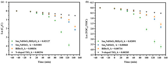 According to Figure 18a,b, the kinetic constants k obtained from the kinetic curves (KC) of MP concentration and VLIRD time reached 0.02127 min−1 or 0.01001 min−1 or 0.00836 min−1 or 0.00836 min−1, respectively, using SBHP, Sm2NdSbO7, BiDyO3, or N-T. And the kinetic constant k of TOC concentration (KTOC) reached 0.02091 min−1 or 0.00868 min−1 or 0.00734 min−1 or 0.00285 min−1.