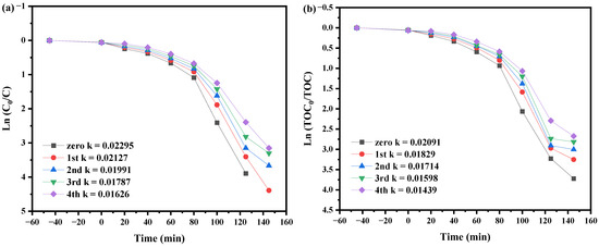 The results from Figure 19a,b show that in the four-cycle deterioration tests, the kinetic constant k obtained from the kinetic curve of MP concentration and the VLIRD time of SBHP ranged from 0.02127 min−1 to 0.01626 min−1. The kinetic constant k for the degradation test in four cycles using SBHP ranged from 0.01829 min−1 to 0.01439 min−1. The experimental data from Figure 18a,b and Figure 19a,b indicated that the PHDE of MP, produced from PW by SBHP under VLIRD, followed first-order reaction kinetics.