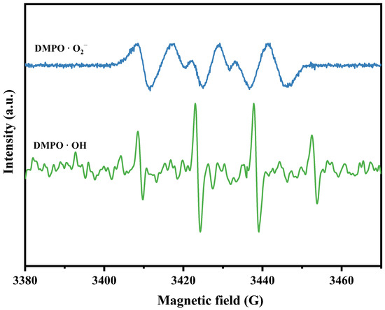 EPR analysis was used to study the production of •O2− and •OH in the PHDE process [89,90,91]. We prepared a solution by combining 20 mg of the SBHP sample, 90 µL of DMPO (1 mol/L), and 1 mL of deionized water for the purpose of detecting the •OH radicals or •O2− radicals generated by SBHP in our experiment. Figure 21 demonstrates that after being exposed to visible light for 10 min, a four-line signal with a 1:2:2:1 intensity ratio, characteristic of the DMPO •OH signal, was identified. In addition, the EPR spectra showed a clear signature of DMPO •O2− with four conspicuous peaks of equal intensity ratio 1:1:1:1. This observation suggested the presence of superoxide radicals. The results indicated the simultaneous generation of •OH and •O2−. The elevated relative intensity of the EPR signals suggested a higher production of these reactive radicals. The concentration of hydroxyl radicals surpassed the generation of superoxide radicals. The outcomes were consistent with the results of the radical-scavenger tests discussed previously.