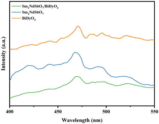 PL spectra of Sm2NdSbO7, BiDyO3, and SBHP.