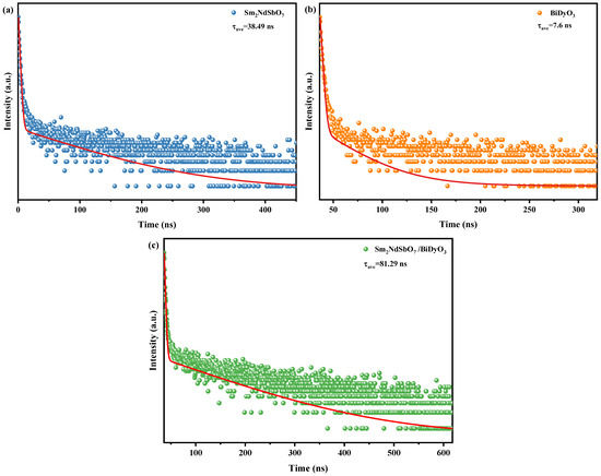 A variety of effective characterization techniques were used to thoroughly understand the interfacial carrier dynamics and recombination. The PL spectra in Figure 22 show emission peaks at 470 nm for all samples. The PL emission of the sample may be caused by the recombination of the excitation associated with the defect through the excitation–excitation collision process. After the sample is excited, an electron-hole pair is generated, where the hole is in the valence band or defect-related position and the electron is in the conduction band or defect-related position, both of which emit photons during the recombination process [92,93], thus producing a light emission spectrum as shown in Figure 22. The SBHP has the lowest emission peak intensity, which means the lowest recombination rate of electrons and holes, indicating that the SBHP has the highest catalytic activity. A heterostructured sample could significantly improve the photocatalytic action on MP. Moreover, the study also demonstrated additional proof that SBHP has the most potent photocatalytic properties. Figure 23a–c displays the TRPL spectra of SBHP (τ1 = 1.652 ns, τ2 = 146.5 ns, τave = 81.29 ns), which presented a much higher PCC lifetime than Sm2NdSbO7 (τ1 = 1.752 ns, τ2 = 111.5 ns, τave = 38.49 ns) and BiDyO3 (τ1 = 1.61 ns, τ2 = 36.56 ns, τave = 7.6 ns), which indicated that SBHP was endowed with unbeatable photocatalytic efficacy over the individual Sm2NdSbO7 and BiDyO3.