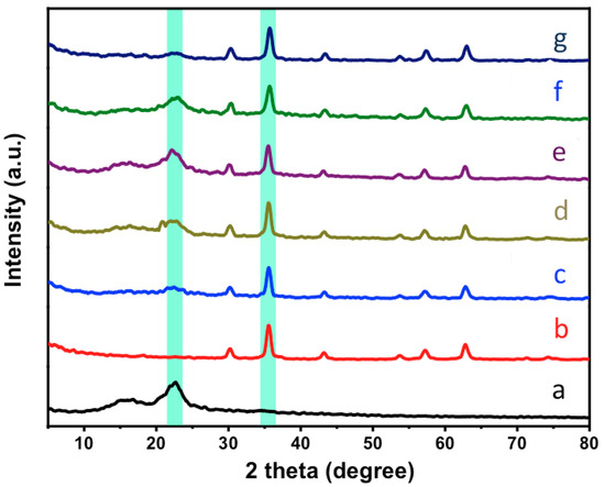X-ray diffraction of different photocatalysts: (a) SCB:M (1:0); (b) SCB:M (0:1); (c) SCB:M (1:1); (d) SCB:M (2:1); (e) SCB:M (3:1); (f) SCB:M (5:1); and (g) SCB:M (1:2).