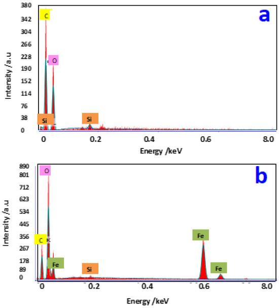 The EDX results of pristine SCB and SCB augmented with Fe3O4 NP (SCB:M 3:1) composite are displayed in Figure 3. The surface of solo SCB principally consisted of C (53.61%), Si (0.64%), and O (45.75%), while SCB augmented with Fe3O4 NPs mainly comprised C (22.63%), O (46.54%), Si (0.51%), and Fe (30.22%). The C percent presented a decline after adjustment and modifications, from 53.61% to 22.63%, due to SCB mainly consisting of C and O. In the spectrum of SCB augmented with Fe3O4 NPs, the peaks of Fe appeared, indicating the successful mixing of Fe3O4 and SCB. The two-dimensional EDX mappings of SCB and SCB mixed with Fe3O4 are given in Figure 3a,b, respectively. The C, O, Si, and Fe mappings accessible in SCB: M sample verify the uniform atom distribution, well equivalent with the SEM image.